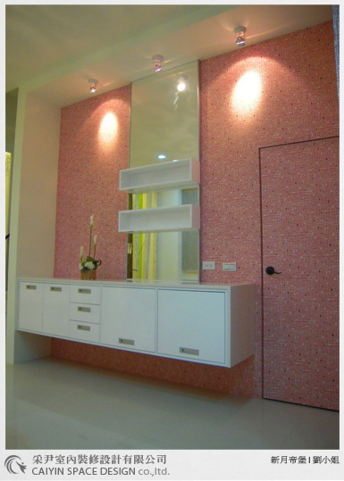 牆面碎花粉紅壁紙.將門片也隱藏為牆面的一部份