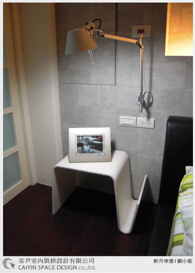 床頭的閱讀燈造型簡單.選擇白色且充滿設計風味的床頭櫃